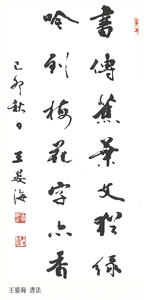 王晏海生於山東日照,字如堂,原名紹密,專長書法,1957年任教中學,國學淵博,為人謙卑自牧,書法寫出自己的格律,學生非常敬佩,時常向他請教。1986年於「省嘉商」退休仍受聘嘉義地區多所高 中兼授國文及書法。嘉義市藝文書道會會員、第3屆常務理監事。作品會獲台灣區文化杯第7屆書法賽長青組第1名,入選中部美展及日本書藝院推薦多次。曾任台灣區文化杯第12屆及台南市國學杯書法評審、嘉義市藝文書道會及雲林蘭亭書畫交流會學術顧問。